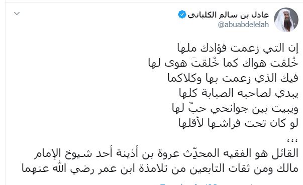 مشرف الشهري A Twitter إن التي زعمت فؤادك ملها خلقت هواك كما خلقت هوى لها ويبيت بين جوانحي حـب لها لو كان تحـت فراشها لأقلها بيضاء باكرها النعيم فصاغها بلباقة فأدقها وأجلها