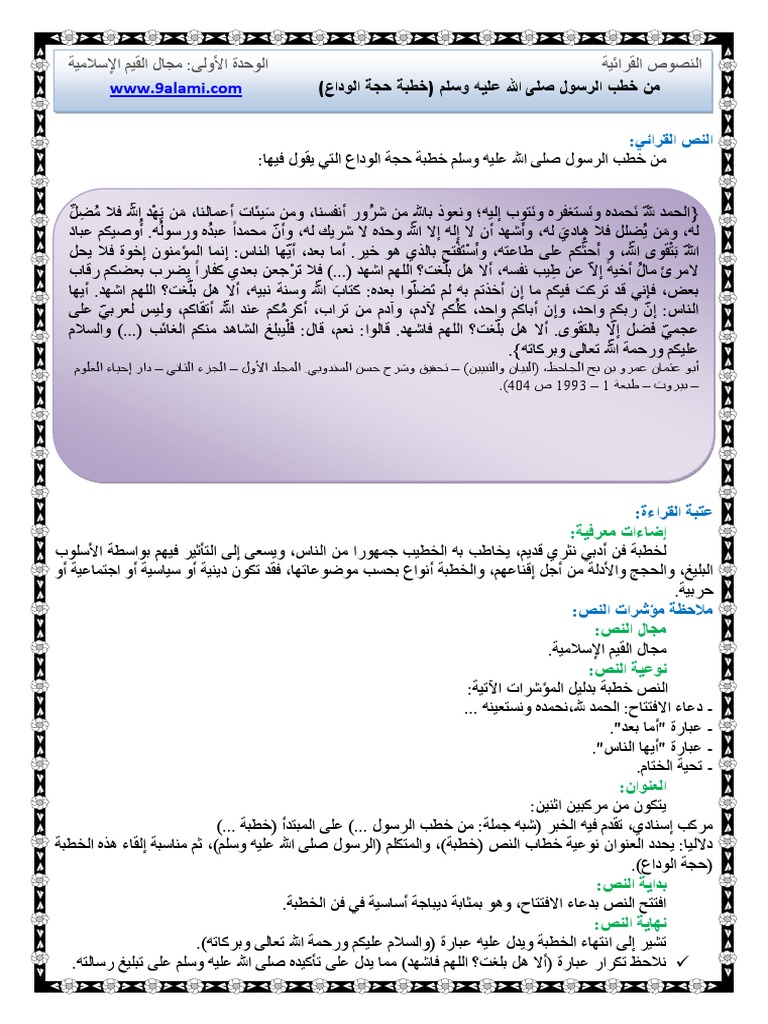 تحضير النص القرائي من خطب الرسول صلى الله عليه وسلم خطبة حجة الوداع للأولى إعدادي اللغة العربية البستان