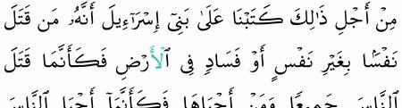 م ن ق ت ل ن ف س ا ب غ ي ر ن ف س أ و ف س اد ف ي ال أ ر ض ف ك أ ن م ا ق ت ل الن اس ج م يع ا و م ن أ ح ي اه ا ف ك أ ن م ا أ ح ي ا الن اس ج م يع ا